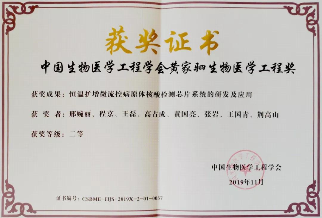 就在近日,“恒溫擴增微流控病原體核酸檢測芯片系統(tǒng)的研發(fā)及應(yīng)用”項目喜獲黃家駟生物醫(yī)學(xué)工程獎技術(shù)發(fā)明類二等獎,是生物醫(yī)學(xué)和工程界對該項目的再一次極大肯定。